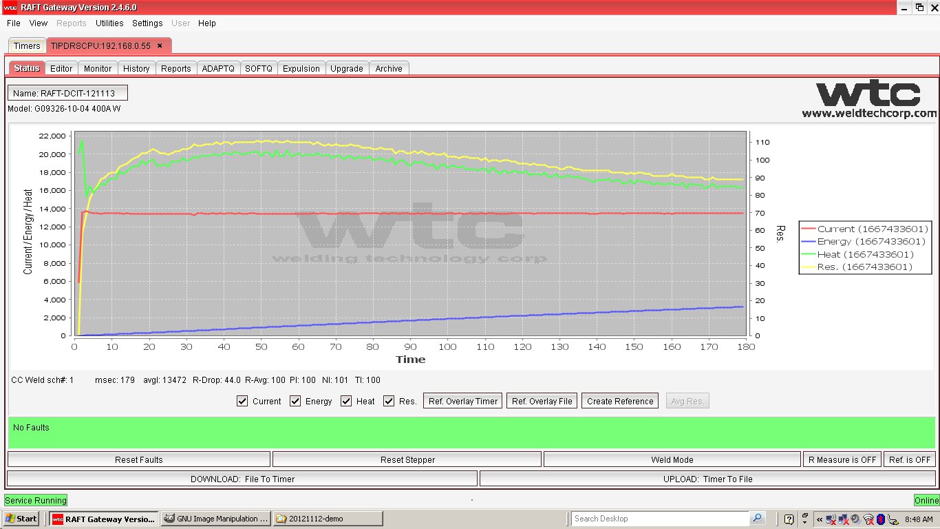 We need to make a reference weld. We need to season the welding caps with a series of approximately 15 welds. In doing this seasoning, we can adjust the welding current that will produce a quality reference weld. Doing a series of 179 mS welds, starting with the current setting for stack 1 of 8000A and increment it upwards until you see a reasonable amount of resistance drop.