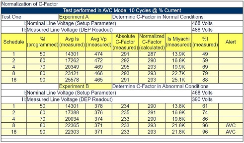 If the actual line voltage is equal to the nominal voltage, then the normalized C-Factor is simply the absolute C-Factor. If the actual voltage decreases, then the absolute C-Factor is multiplied by a value that is higher than unity to yield the normalized C-Factor. This "normalization" factor is to determine what the C-Factor would have been if the voltage would have stayed constant.
