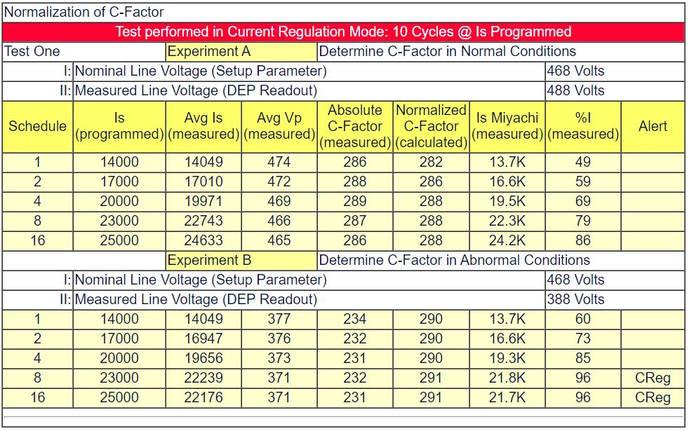 A value called "Absolute" C-Factor was calculated by taking the Average Secondary Current and dividing it by the measured percent current.Observation 1: The Normalized C-Factor values remain fairly consistent at all ranges of current regardless of the welding bus voltage. This would be useful for tracking the resistance variable of the Ohm’s law equation. Multiplying the Normalized C-Factor by 100 would obtain the value of the maximum current availability had the welding bus voltage remain at the nominal voltage setting.Observation 2: The current regulation routines prove to be performing well. When the Creg routine lacked compensation room, a Creg alert was enunciated.